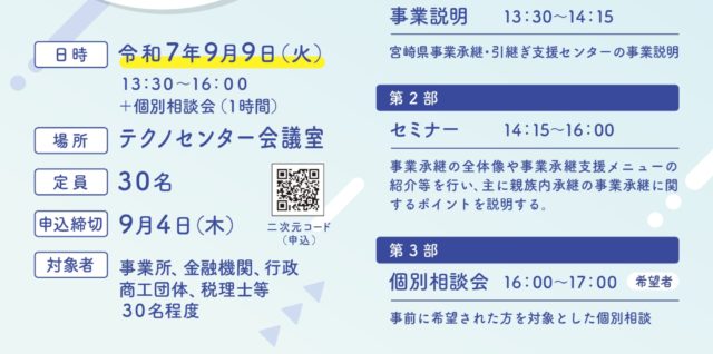 宮崎県アトツギ事業承継セミナー開催のご案内 続きを読む 宮崎県アトツギ事業承継セミナー開催のご案内